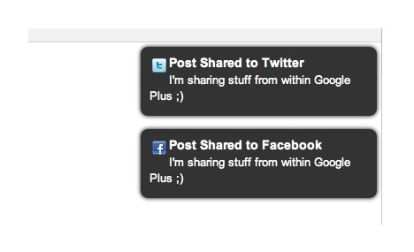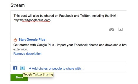 - Automatically post to Facebook and Twitter whenever you share something on Google Plus. (You can turn this on/off from within the share window in Google Plus)